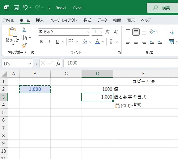 B2の内容を元に、D3に「値と数字の書式」の貼り付けを行ってみます。