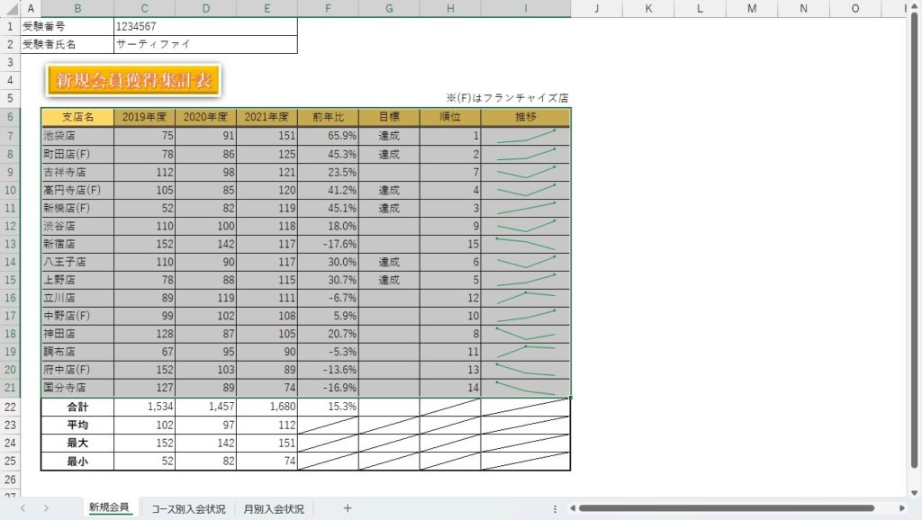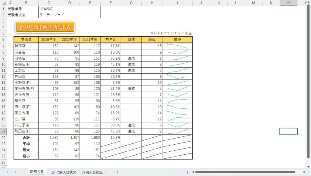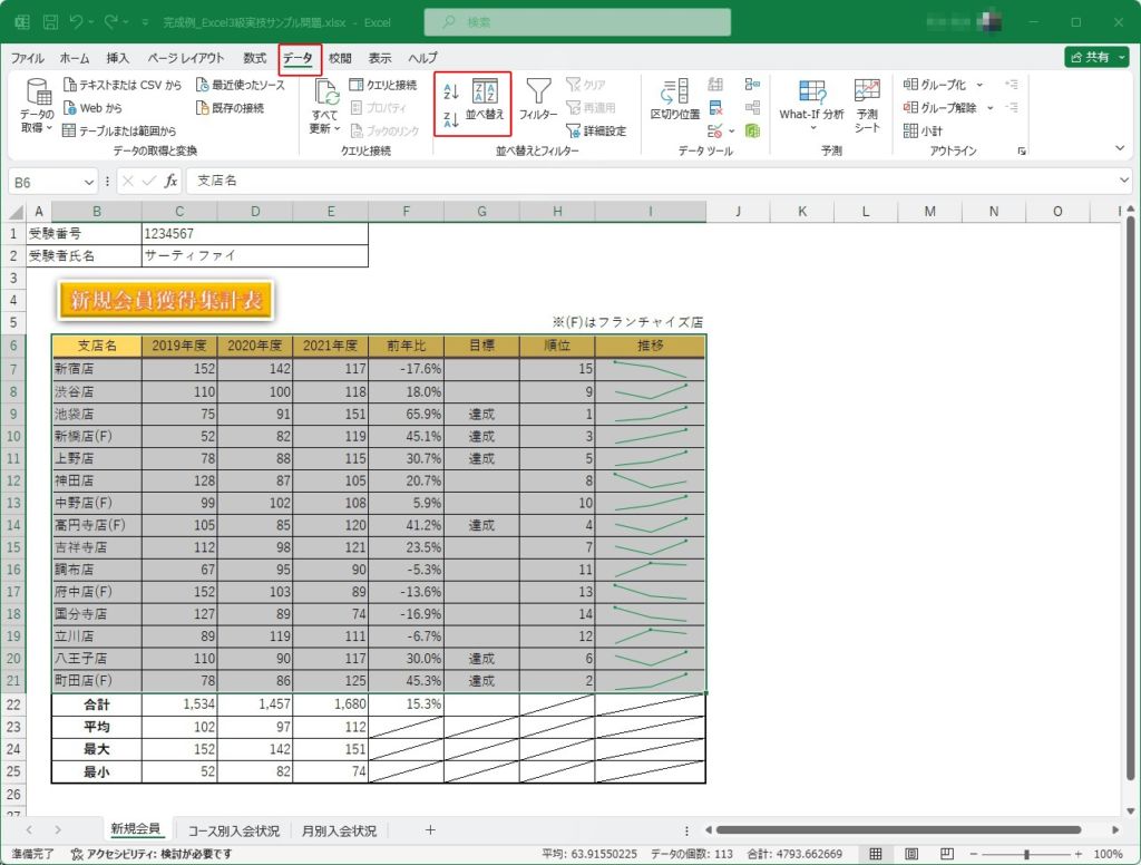 Excel®表計算処理技能認定試験3級実技サンプル問題の2021の完成例をサンプルファイルとして使用しました。
