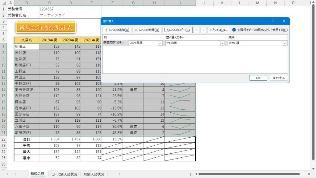 「新宿店」と「八王子店」が2021年度のデータの数値が一致していて、その中で2020年のデータが大きい順に並び替えられていることがわかります。