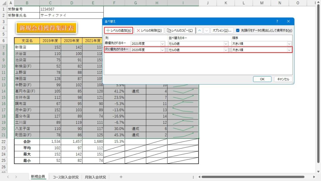 「レベルの追加(A)」ボタンをクリックし、「次に優先されるキー」を追加します。例として「2020年度」の列を「大きい順」で並べ替えます。