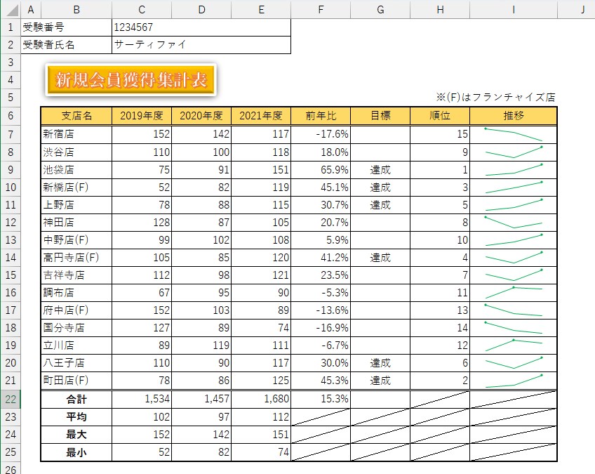 例としてサーティファイの練習問題として無料でダウンロードできるデータの「2021-3」>「実技試験正答例」>「完成例_Excel3級実技サンプル問題.xlsx」を使用します。