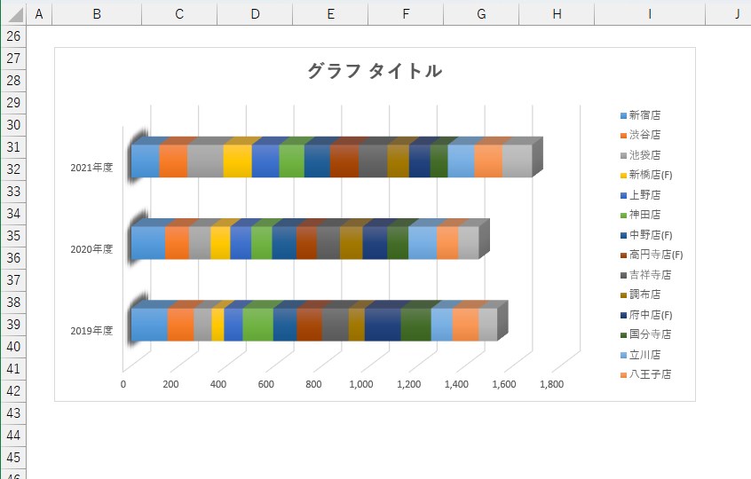 シート「B6~E21」までの範囲で、「行/列」を切り替えで、「3-D 積み上げ横棒」、「グラフスタイル8」、「凡例の位置:右」の条件でグラフを作成します。