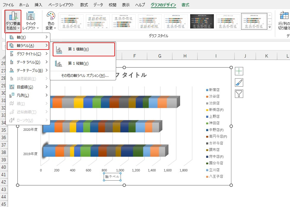 「グラフのデザイン」タブから「グラフ要素を追加」の「軸ラベル」>「第1横軸」を選択します。