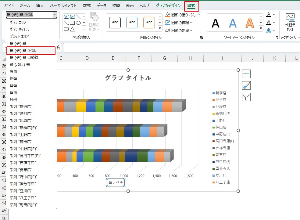 「書式」タブをクリックすると、「現在の選択範囲」グループのプルダウンに「横(値)軸 ラベル」が追加されています。