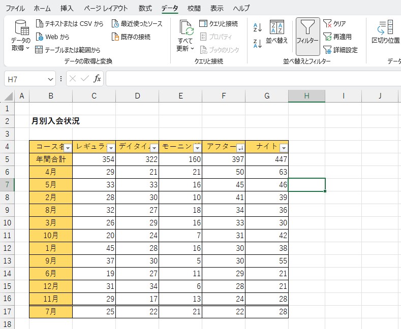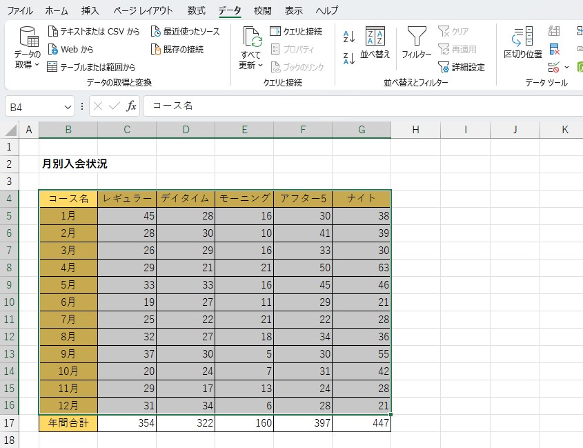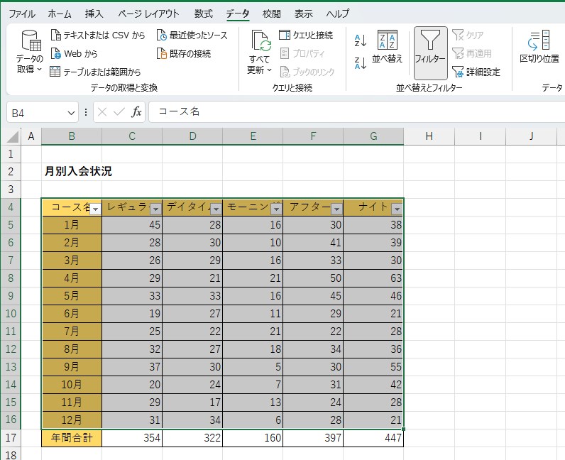 「B4~G16」の範囲を選択し、「挿入」タブの「テーブル」ではなく、「データ」タブの「並べ替えとフィルター」グループの中の「フィルター」をクリックします。