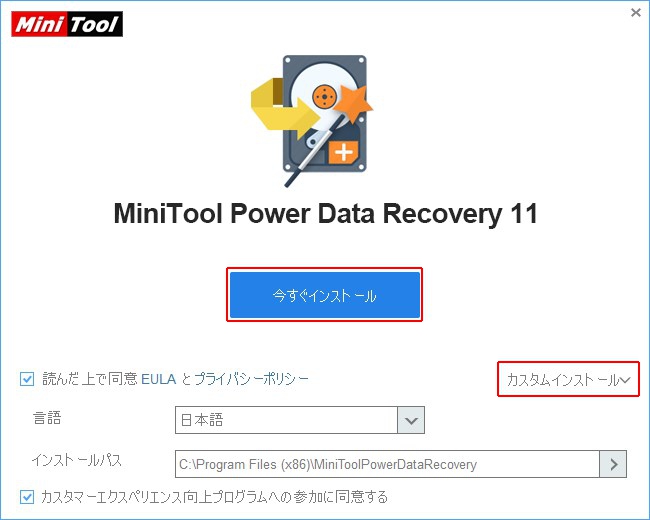 「pdr-free-online.exe」をクリックして、インストールを開始します。「カスタムインストール」をクリックして、言語が「日本語」であることを確認します。インストール先は「復元するデータがあるドライブ」以外の場所に設定してください。