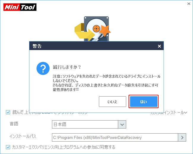 警告が出ますので、条件を満たしたインストール先かを確認した上で「はい」をクリックしてください。