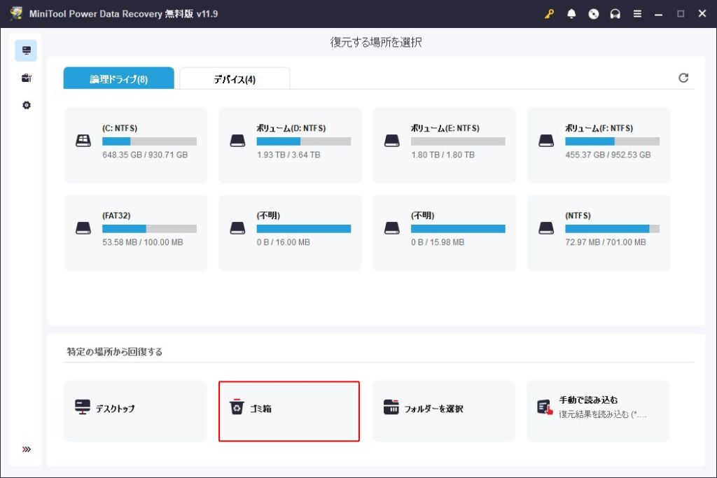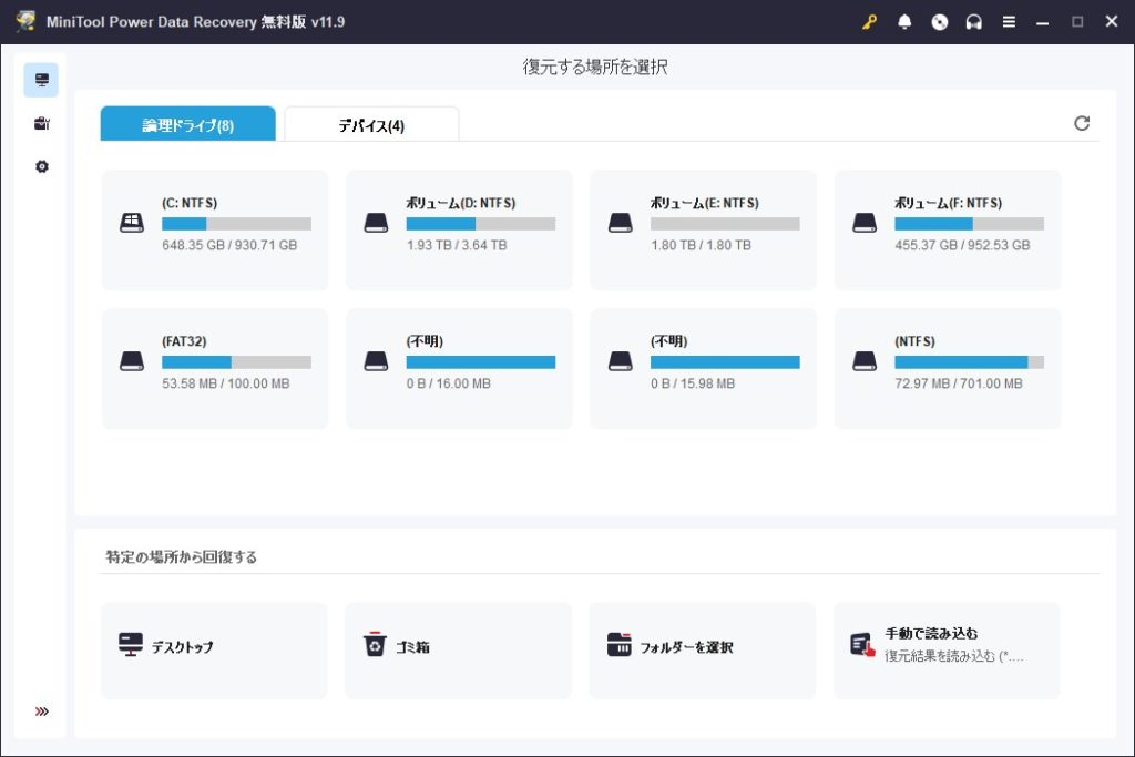 「MiniTool Power Data Recovery」は、ハードドライブ、SSD、USBフラッシュドライブ、SDカードなど、さまざまなデバイスからデータを復元できます。削除されたファイルやフォーマットされたデバイスからもデータを取り戻せる優れたツールです。