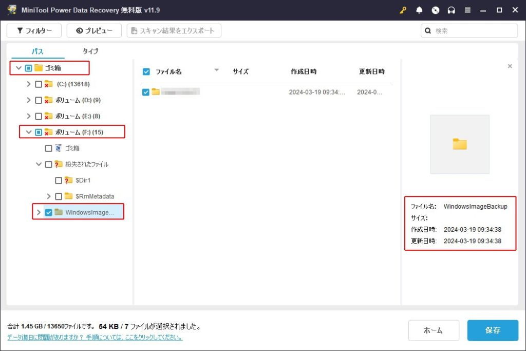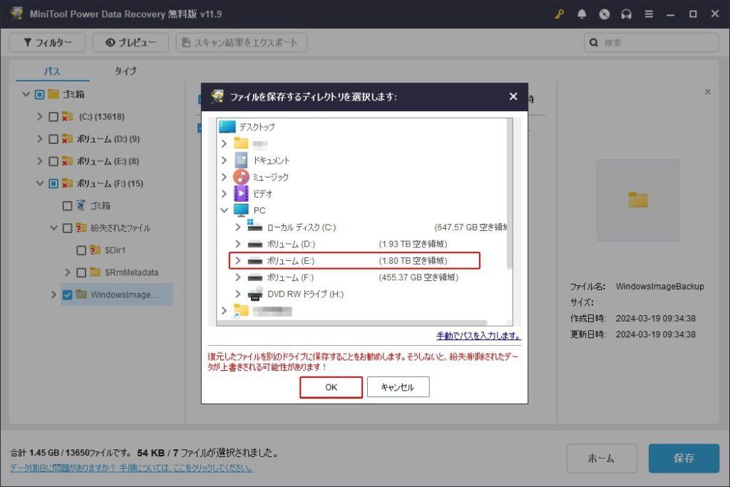 試しに「ボリューム(E:)」に復元データを保存することにします。