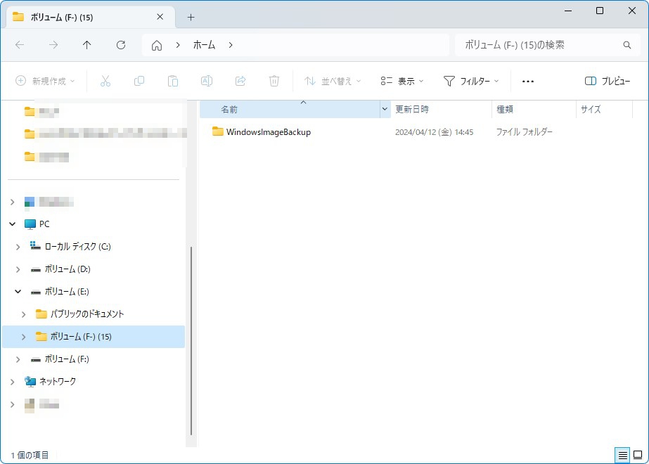 「ボリューム(E:)」に「WindowsImageBackup」フォルダが復元されたことが確認できました。