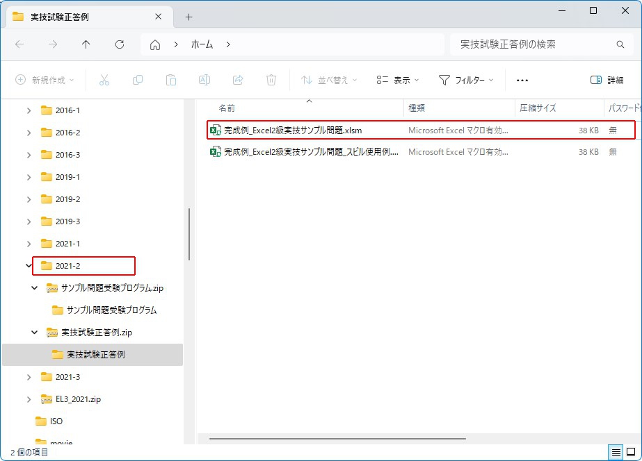 「2021-2」フォルダ内の「実技試験正答例」の中の「完成例_Excel2級実技サンプル問題.xlsm」を使用します。