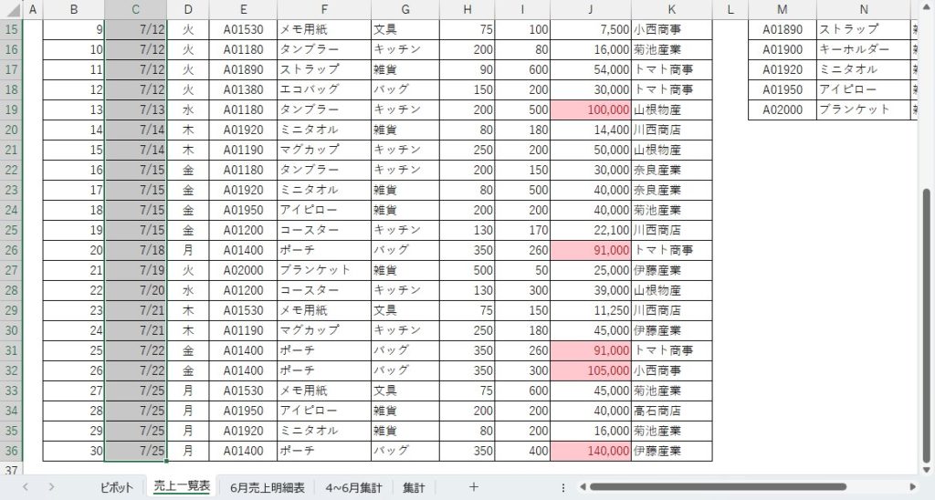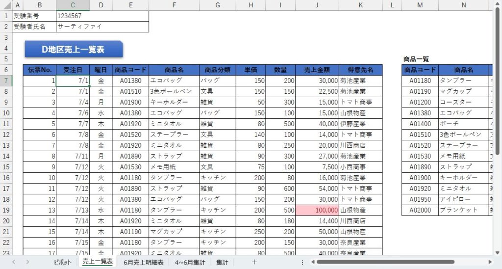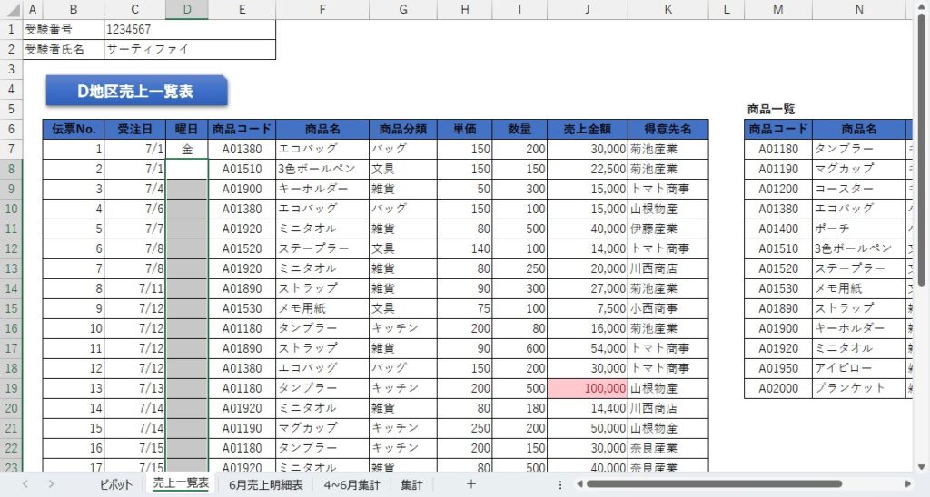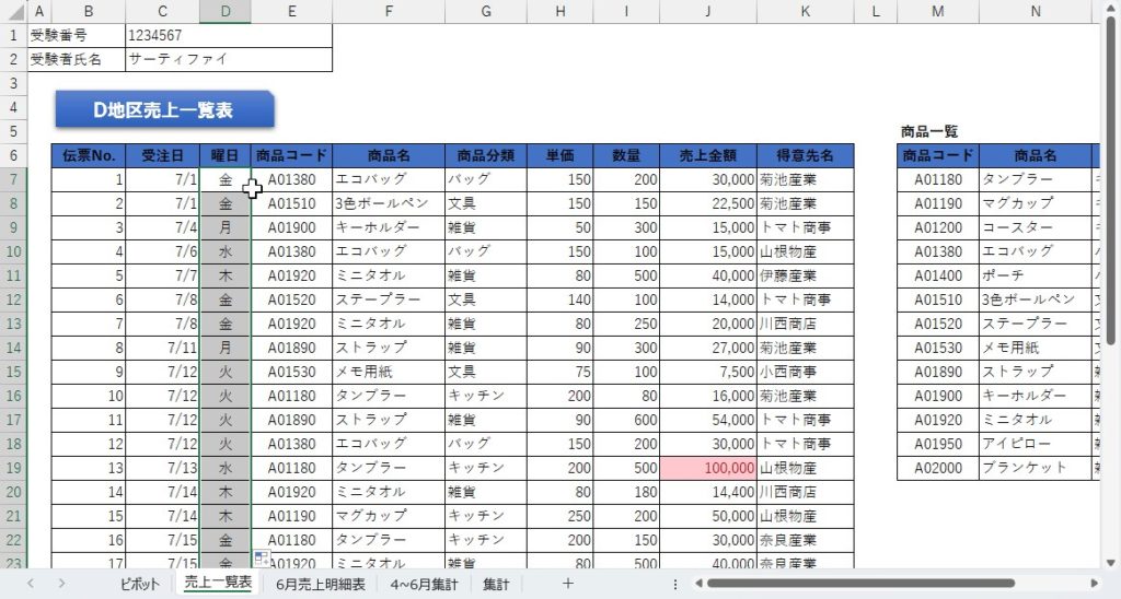 例として、「完成例_Excel2級実技サンプル問題.xlsm」を開き、「売上一覧表」タブ内のテーブルの「受注日」に注目します。※このときサンプル問題を開いた後で、編集ができるように許可をしておくのを忘れないでおいてください。