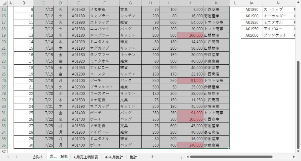 「CTRLキー+SHIFTキー+下」を押してみてください。「受注日」の一番下の行まで一気に選択ができました。