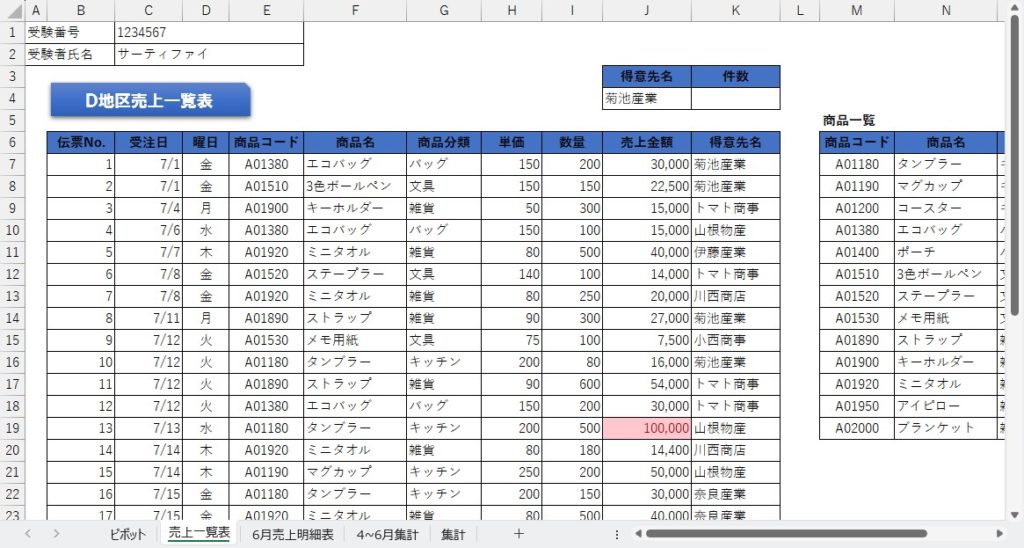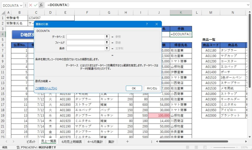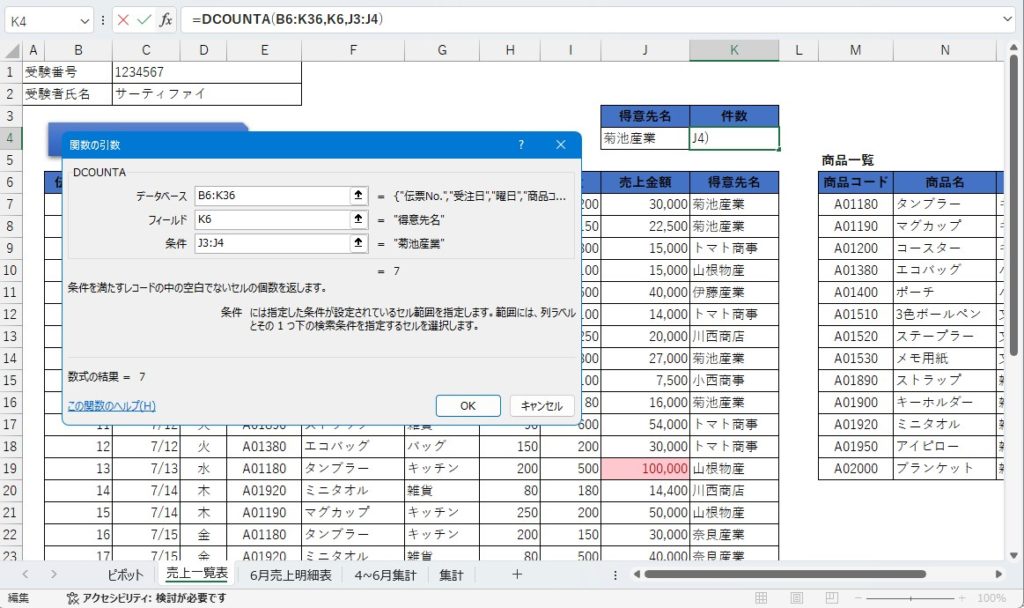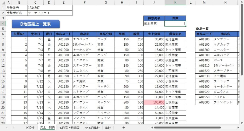 「件数」が「7」と表示されていれば、正しく計算されています。「D地区売上一覧表」の「得意先名」が「菊池作業」のものが「7件」ということを表しています。もちろん使用するデータにより、この値は異なります。
