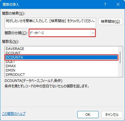 DCOUNTA関数では、「データベース」「フィールド」「条件」の3つを指定することになります。