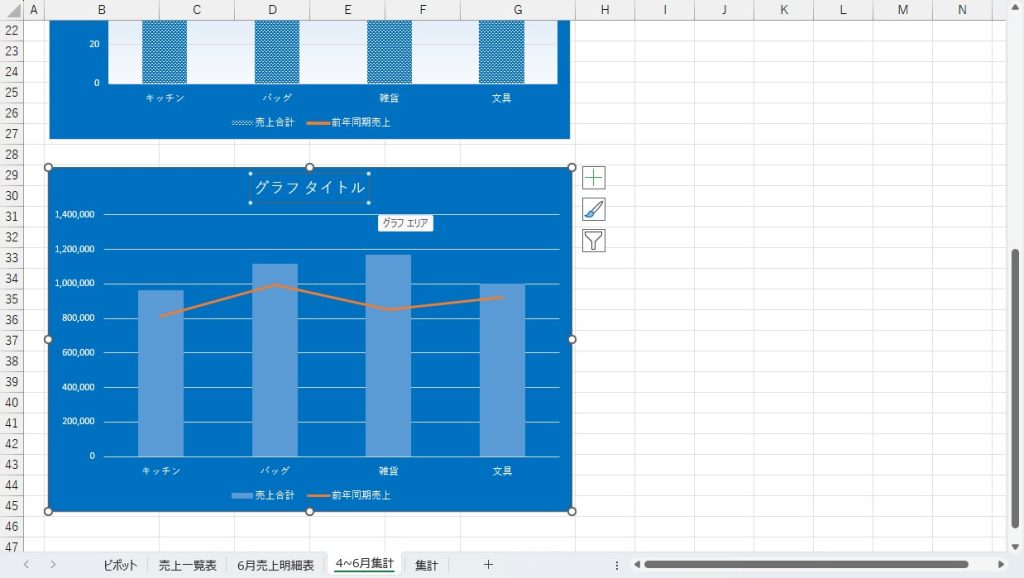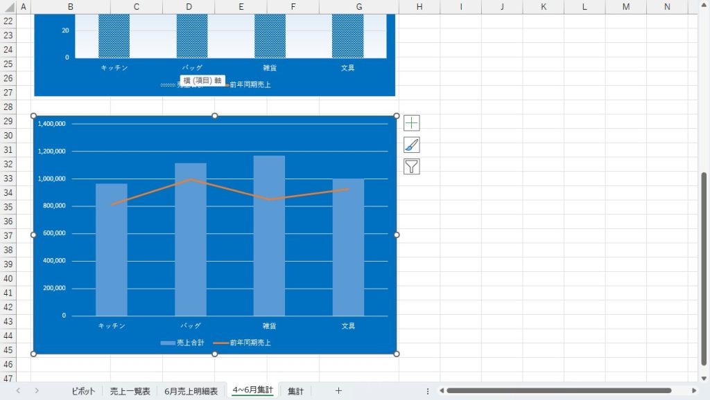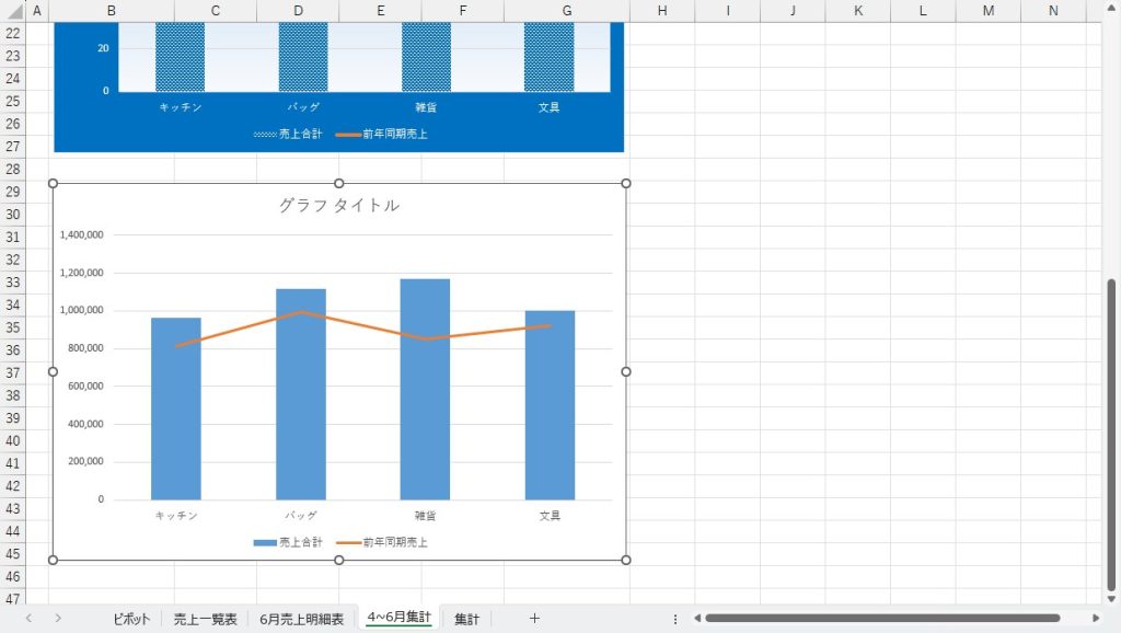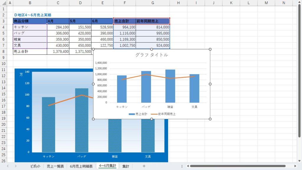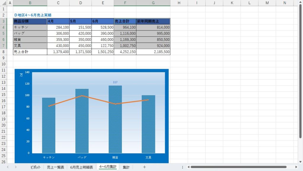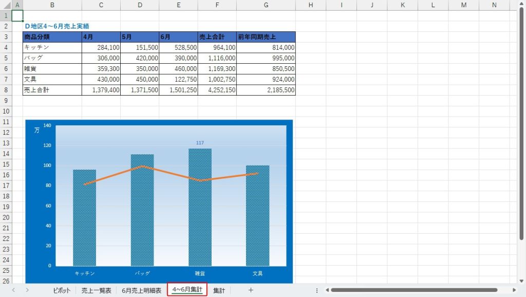 今回使用するシートは「4~6月集計シート」なので、これを開いておきます。グラフが既にありますが、この通りのグラフを作成することを目標とします。