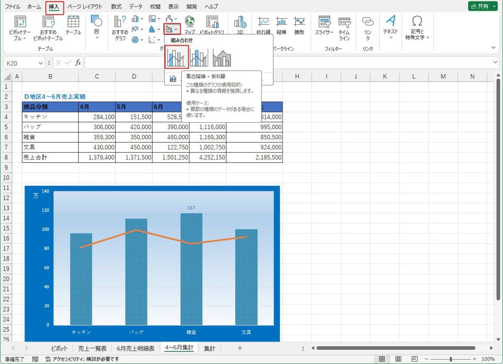 「複合グラフの挿入」は、「挿入」>「グラフ」>「組み合わせ」から行うことができます。その中の「集合縦棒-折れ線」が指示されているので、これを選択します。