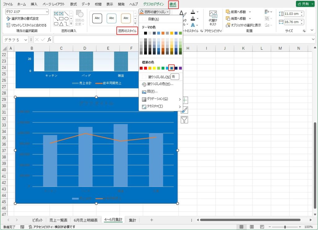 選択は、グラフエリアを選択した状態で、「書式」タブをクリック、「図形のスタイル」グループの「図形の塗りつぶし」から「青(標準の色:1行目8列目)」を選択します。