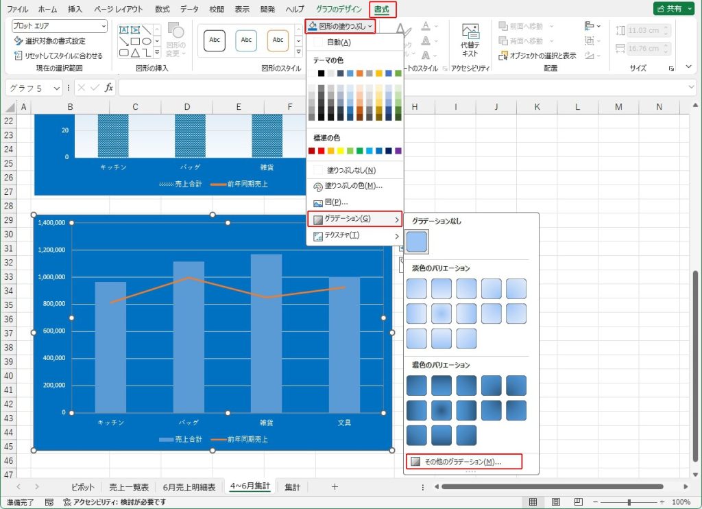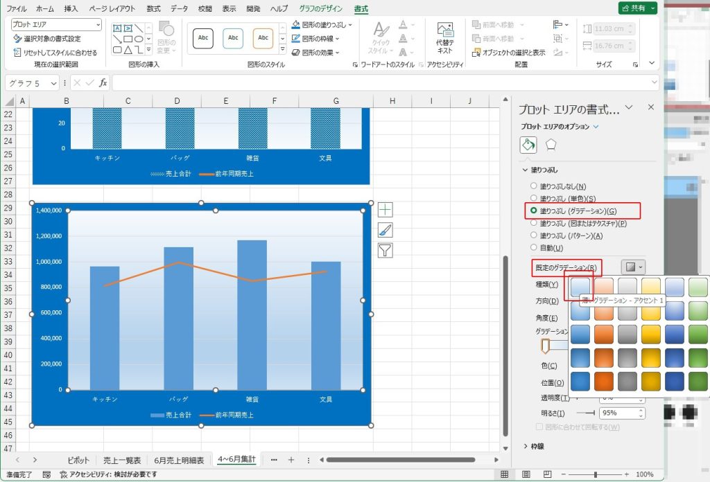 | プロット エリア | 塗りつぶし | グラデーション:既定の グラデーション:薄いグラデ ーション:アクセント1 |