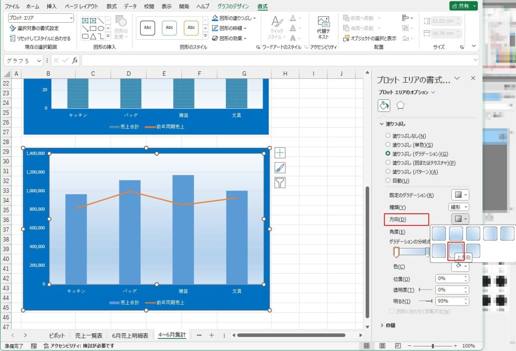 「プロットエリア:塗りつぶし:方向:上方向」という指示ですので、同じく、プロットエリアの書式設定画面から、「方向」を選択し、「上方向」をクリックします。
