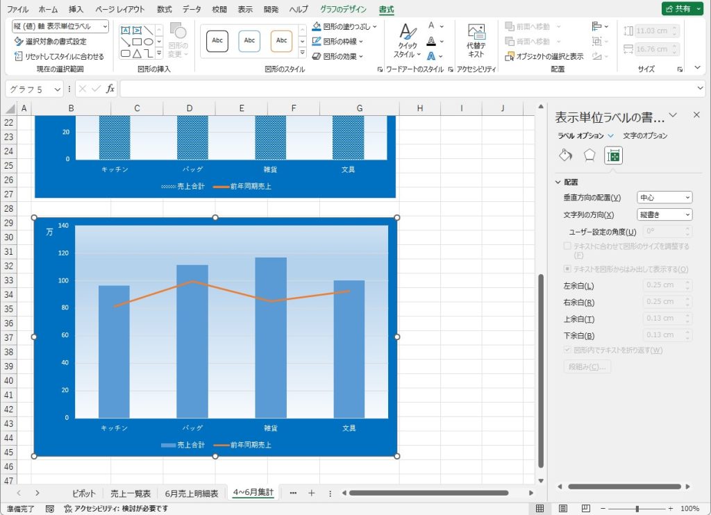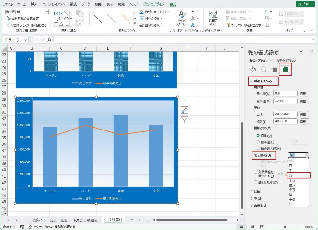 次に「縦(値)軸:表示単位」を「万」にし、「縦(値)軸表示単位ラベル:配置」を「文字列の方向:縦書き」とします。