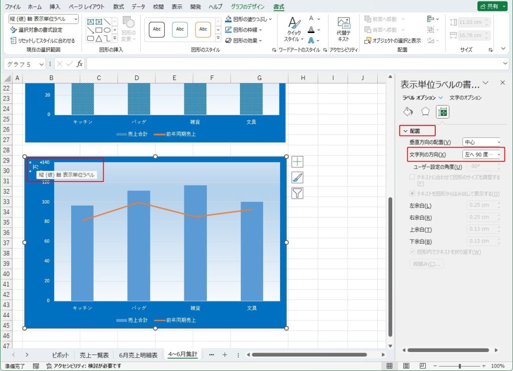 | 縦(値)軸 表示単位 ラベル | 配置 | 文字列の方向:縦書き |