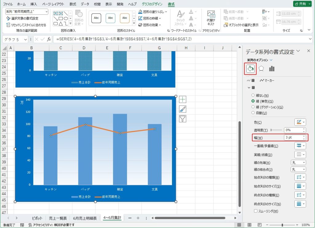 「系列”前年周期売り上げ”」は折れ線グラフのほうなので、「折れ線」をクリックします。そして、データ系列の書式設定の「塗りつぶしと線(バケツのマーク)」をクリックし、その中の「幅」が「線」を表しますので、これを「3pt」に設定します。