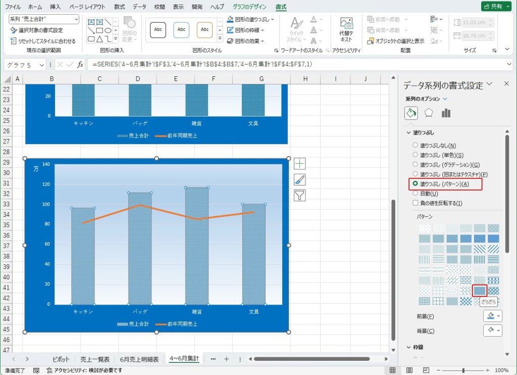 「系列”売上合計”」は縦棒グラフのほうなので、「縦棒グラフ」をクリックします。データ系列の書式設定から、「塗りつぶし(パターン)」を選択し、「ざらざら(7行5列目)」をクリックします。