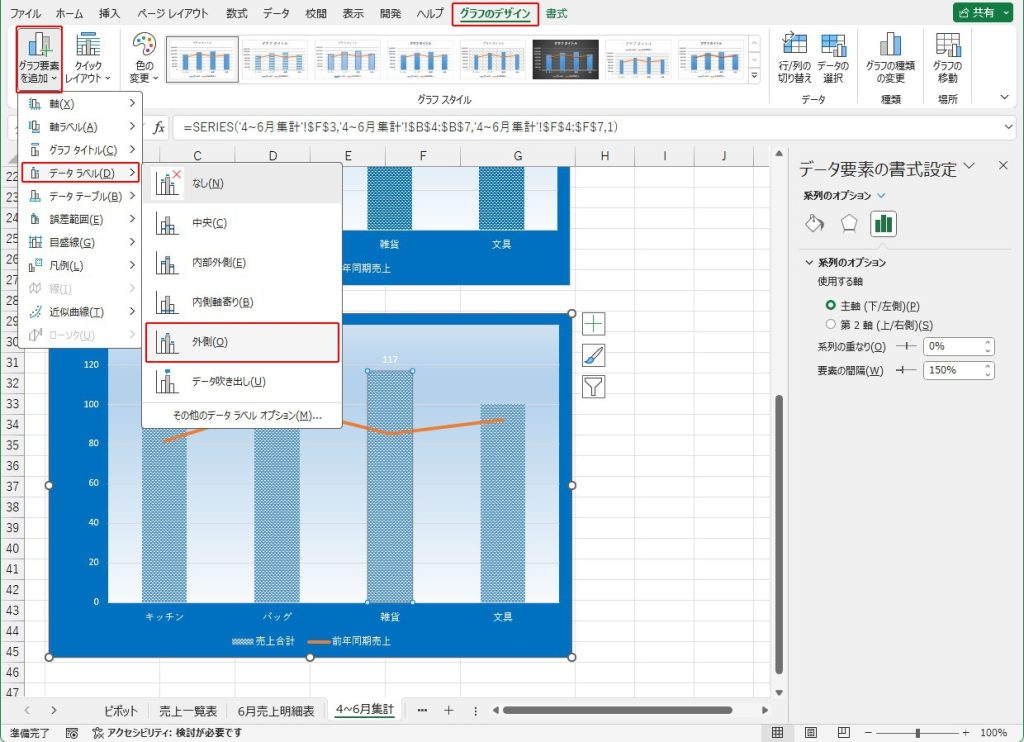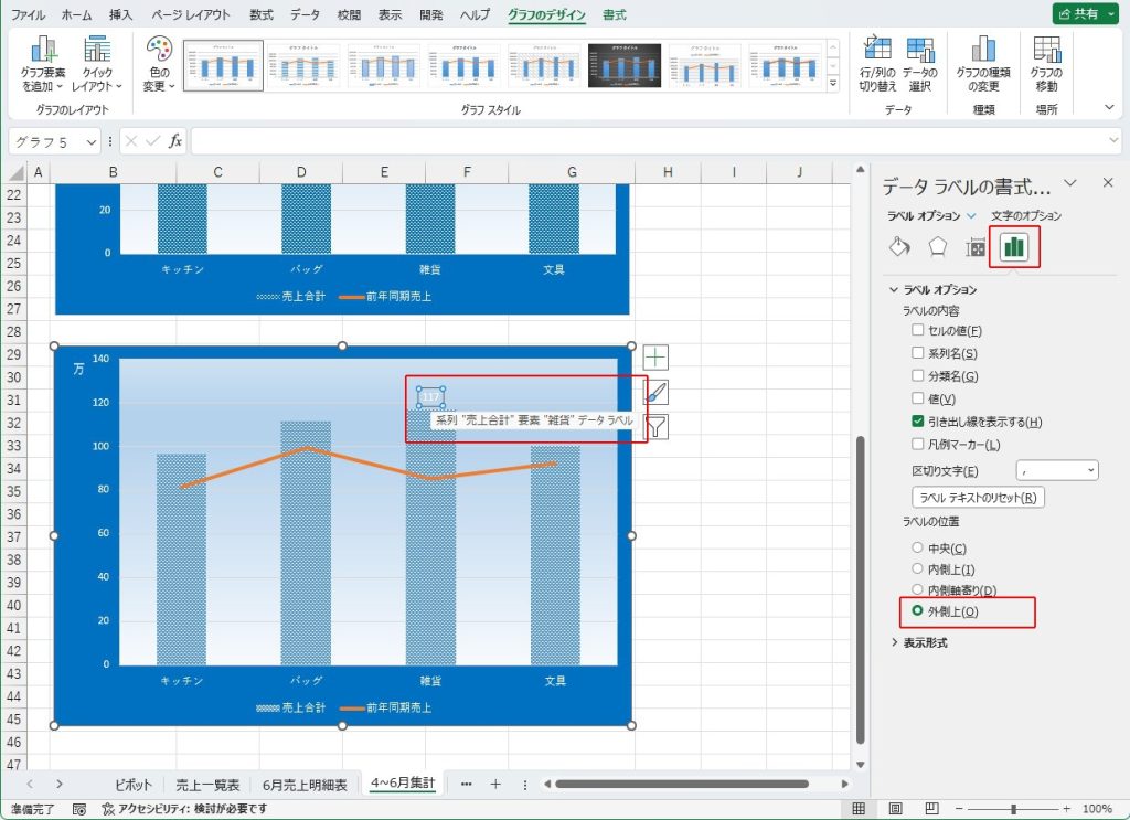 「系列”売上合計”」の「要素”雑貨”」の「データラベル」をクリックし、ラベルの位置を図のように「外側上」に設定します。