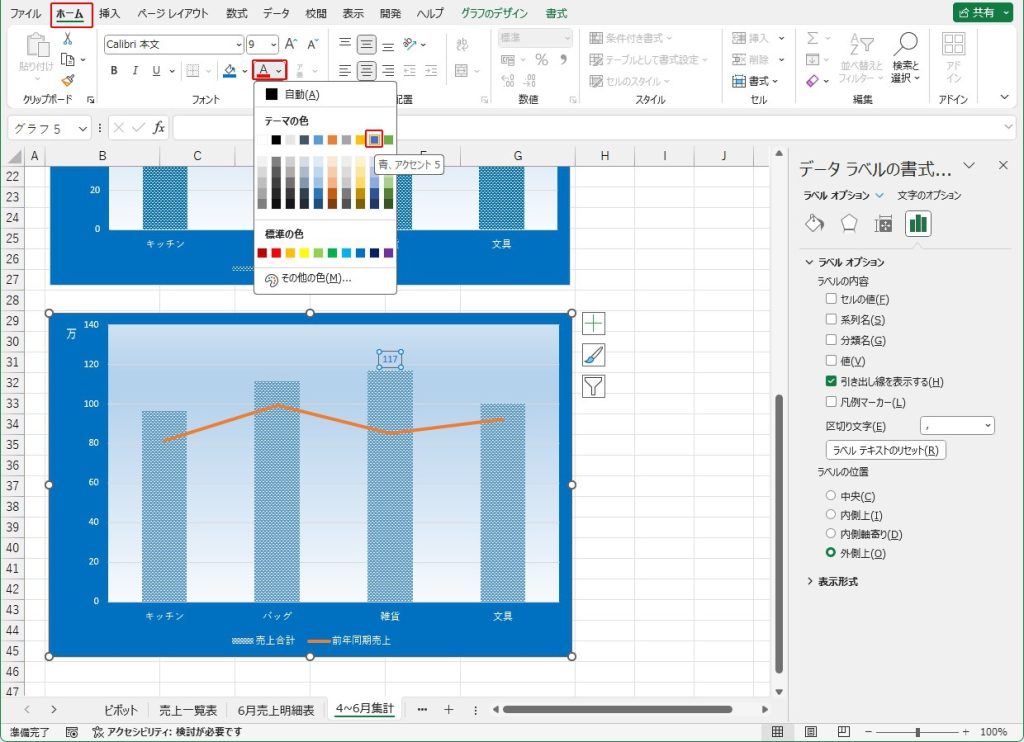 「系列”売上合計”」の「要素”雑貨”」のデータラベルの「フォントの色」を「青、アクセント5(テーマの色:1行9列目)」にします。