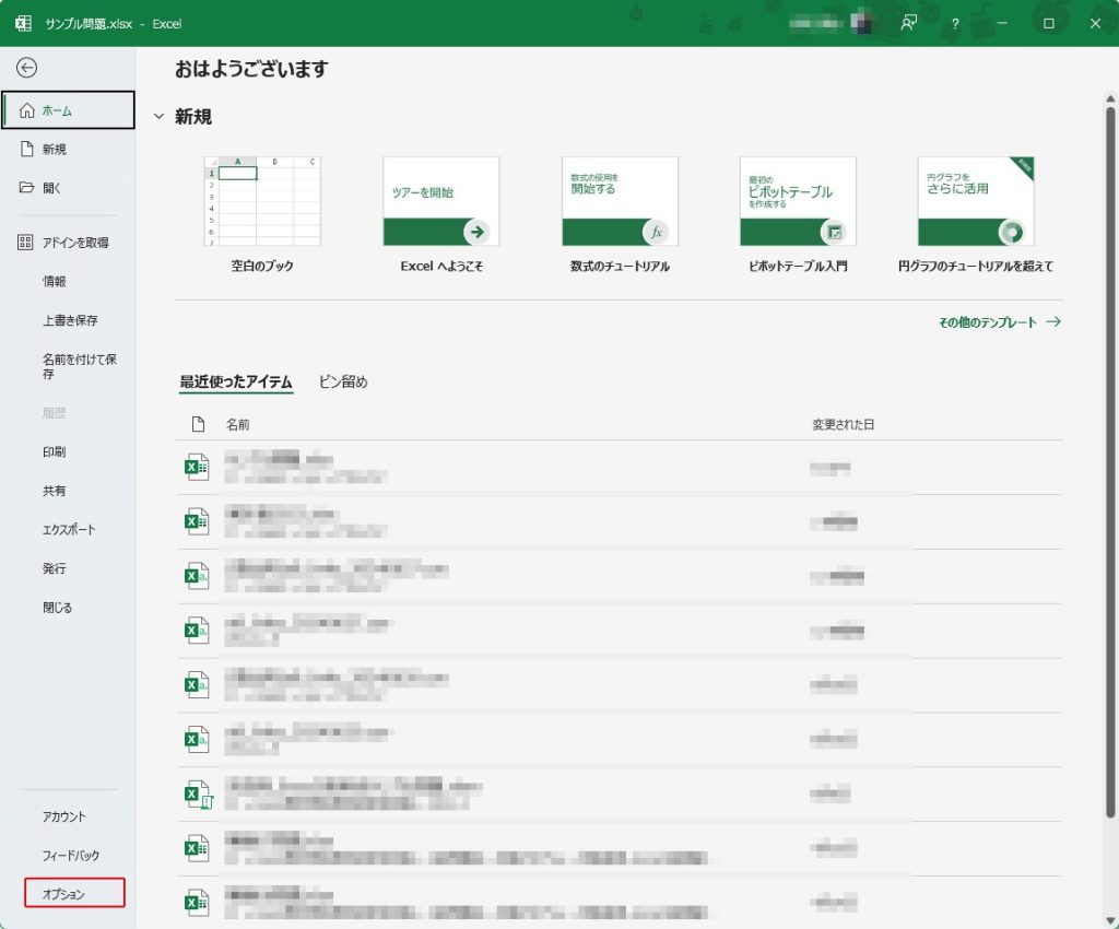 「ファイル」タブをクリックし、「オプション」をクリックします。(「オプション」が「その他」の中に隠れている場合もあります)