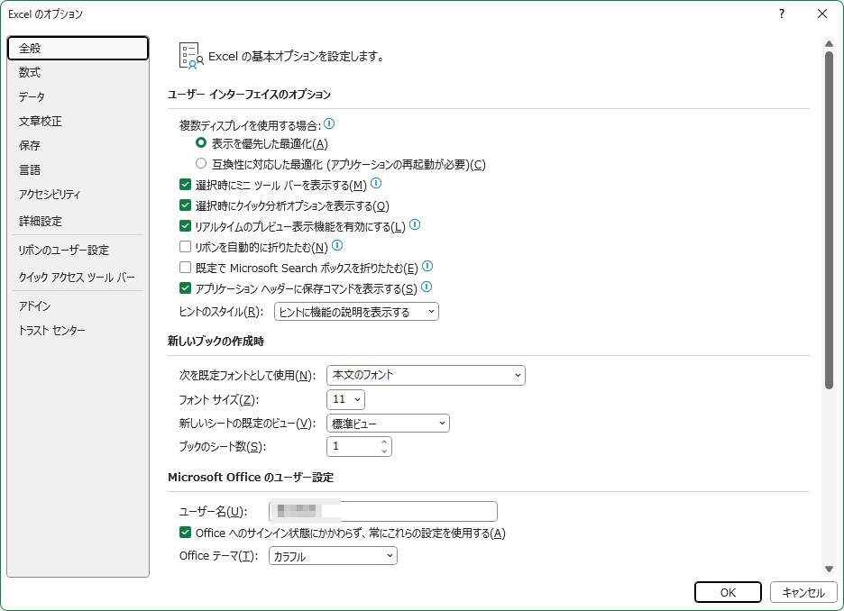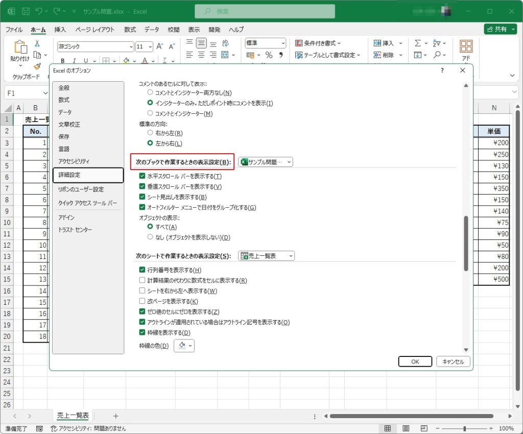 画面左側にある「詳細設定」をクリックし、「次のブックで作業するときの表示設定」欄までスクロールさせます。