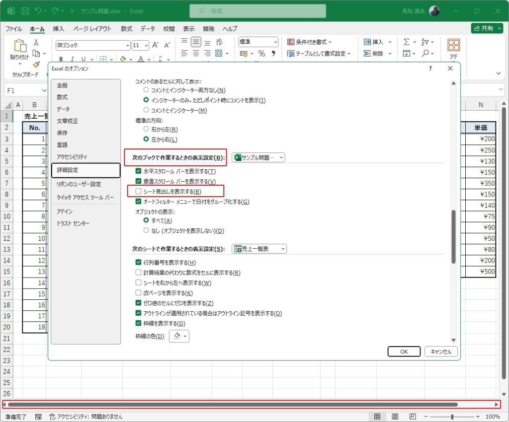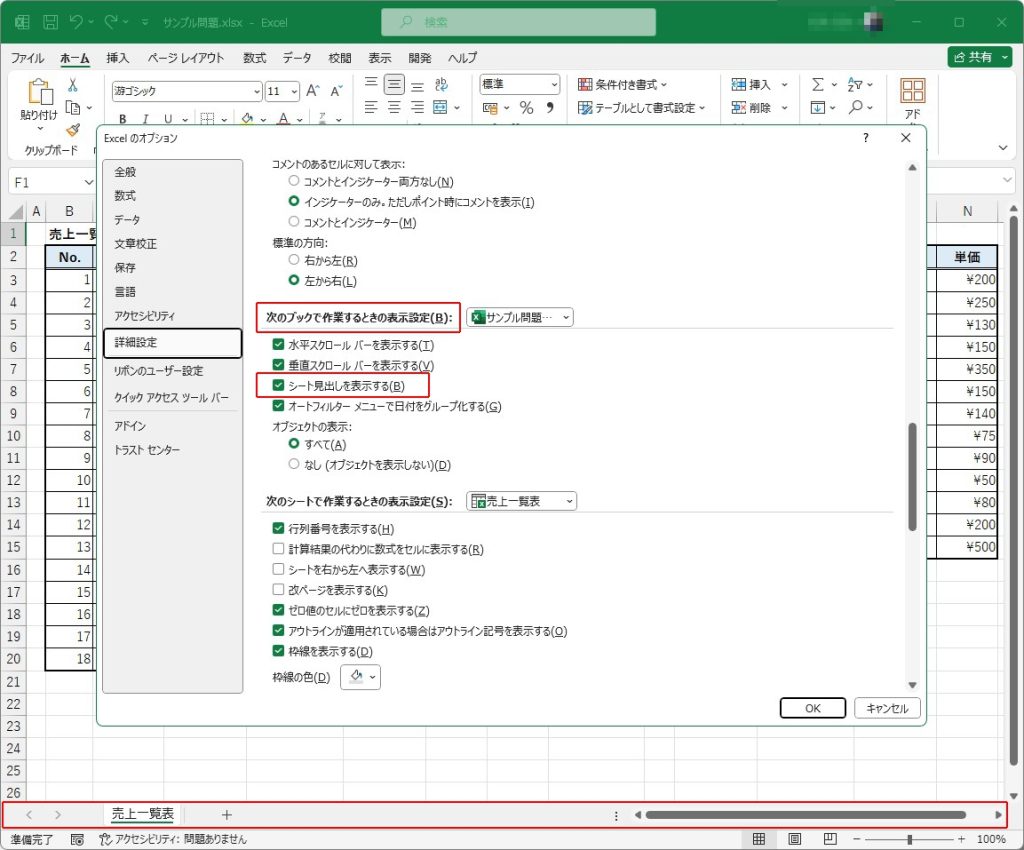 下図のように、「シート見出しを表示する」にチェックが入っていると、図の下の部分の赤枠の「シート見出し」が表示されていることが確認できます。