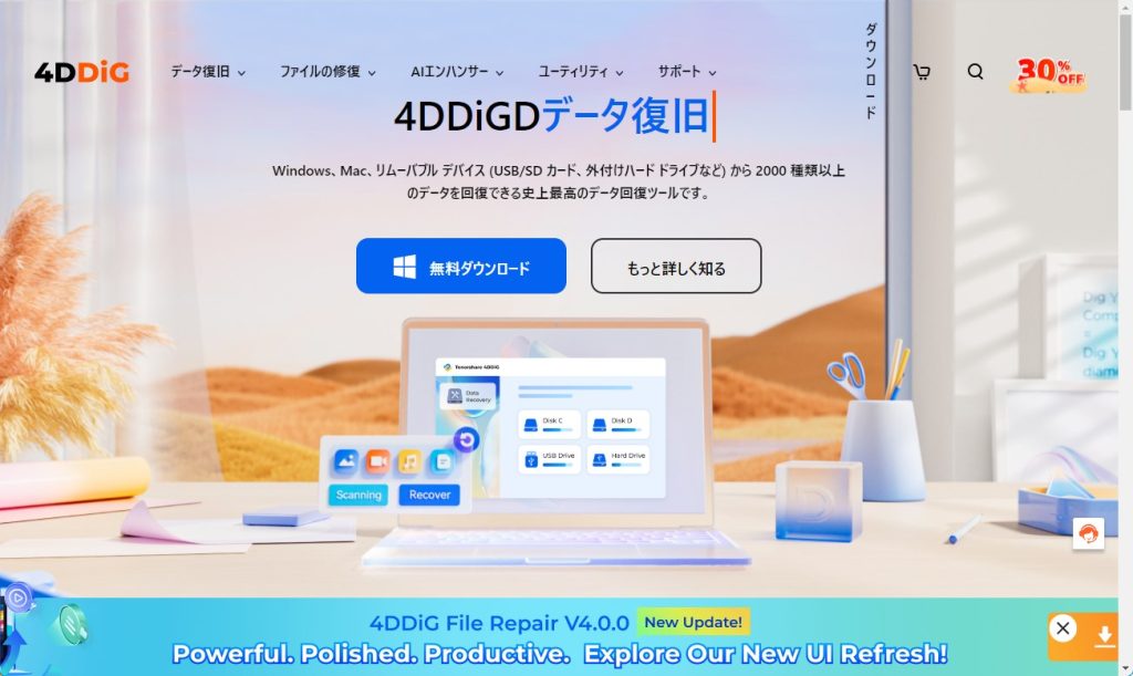 まずは、こちらから4DDiGデータ復元ソフトのページに飛んで、4DDiGデータ復元ソフトをダウンロードします。