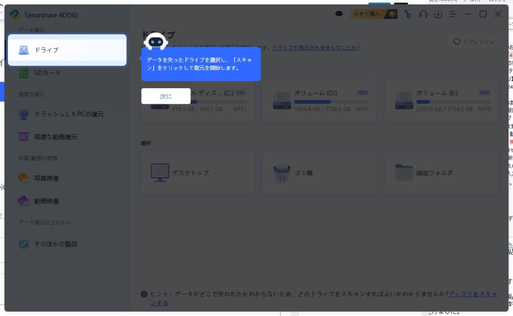 「今すぐ利用」を押して、4DDiGデータ復元ソフトを起動したら準備は完了です。軽いチュートリアルが出ますので、使用方法を確認しながら「次に」を押していきます。