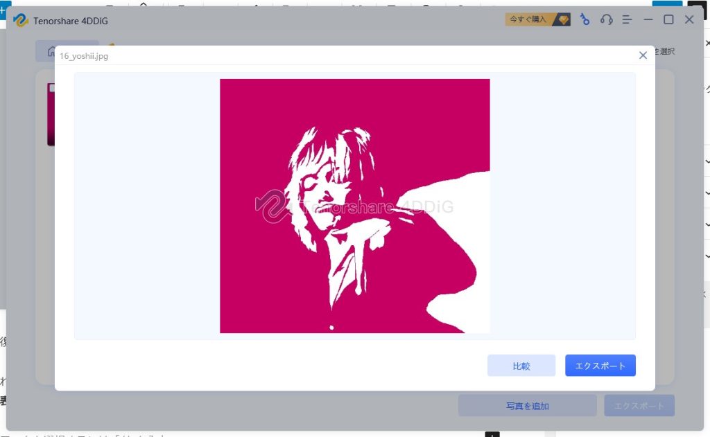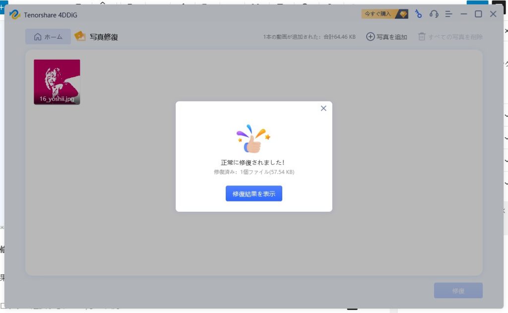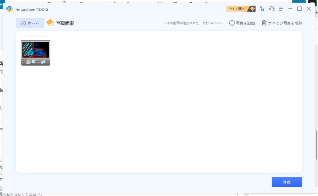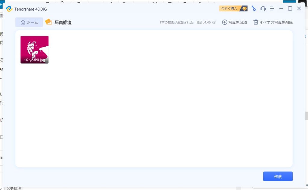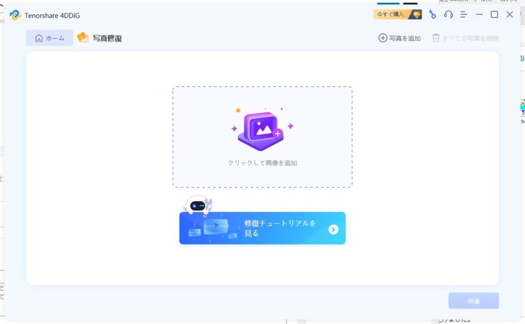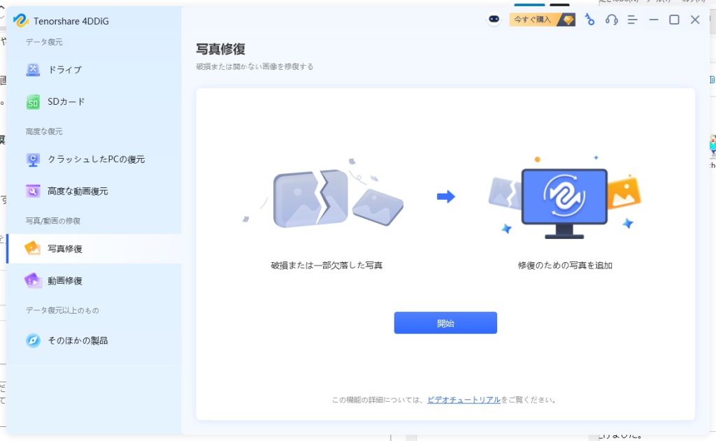 チュートリアルをさくさくと終え、「写真修復」で画像ファイルの修復を試みます。見た目がわかりやすく、初心者の方でもわかりやすいUI(ユーザーインターフェース)となっています。