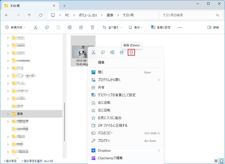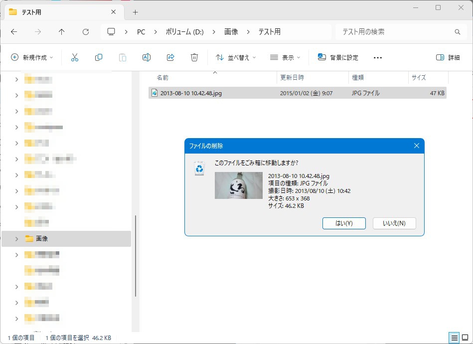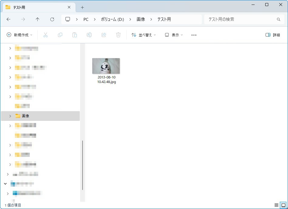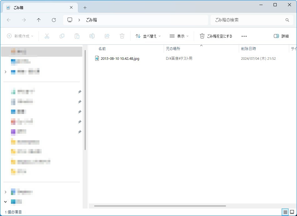 「元の場所」である、「D:\画像\テスト用」フォルダの中身を見てみます。削除したファイルが復元されていますね。このとき、ゴミ箱にファイルはない状態となっています。