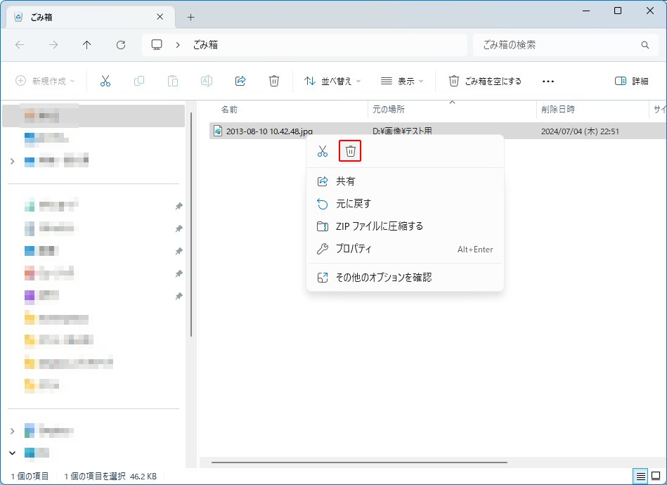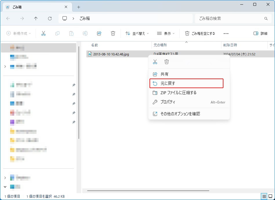 Windowsにもともとある「元に戻す」機能を使って、ゴミ箱の復元を行ってみます。