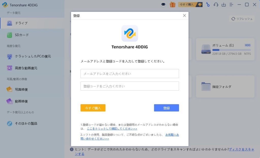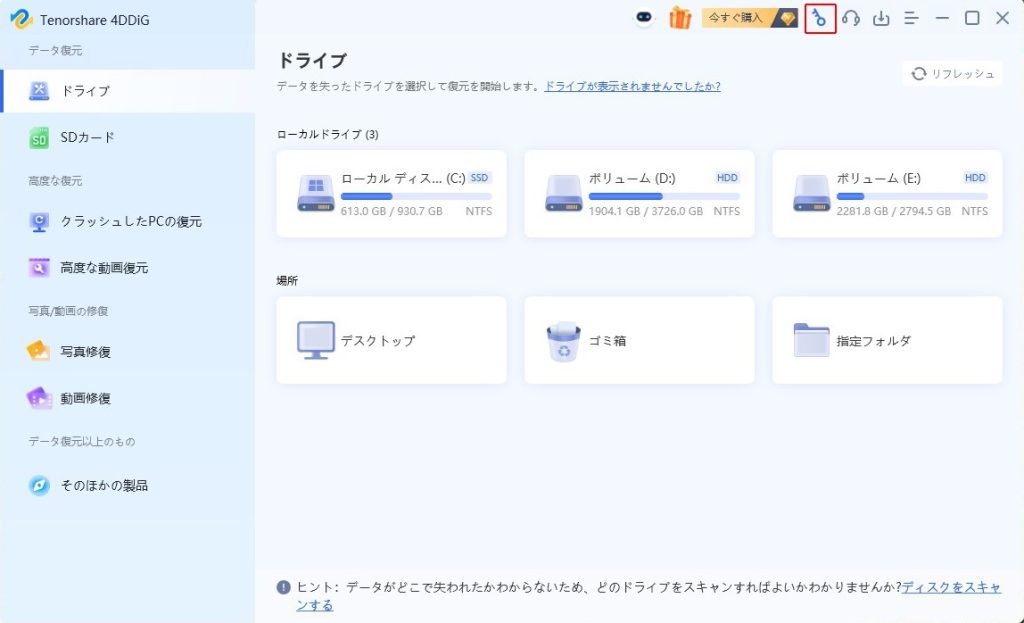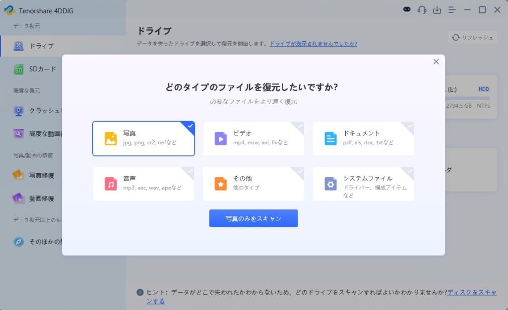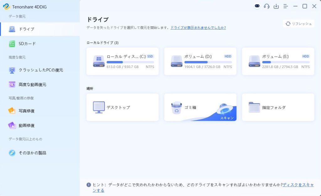 Tenorshare 4DDiGは、ハードドライブ、SDカード、USBドライブなど、さまざまなストレージデバイスからデータを復元できます。どんなデバイスからでも失われたデータを簡単に取り戻せる点が大きな魅力です。