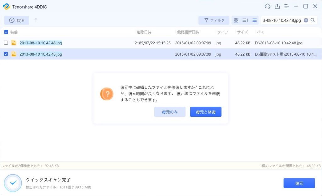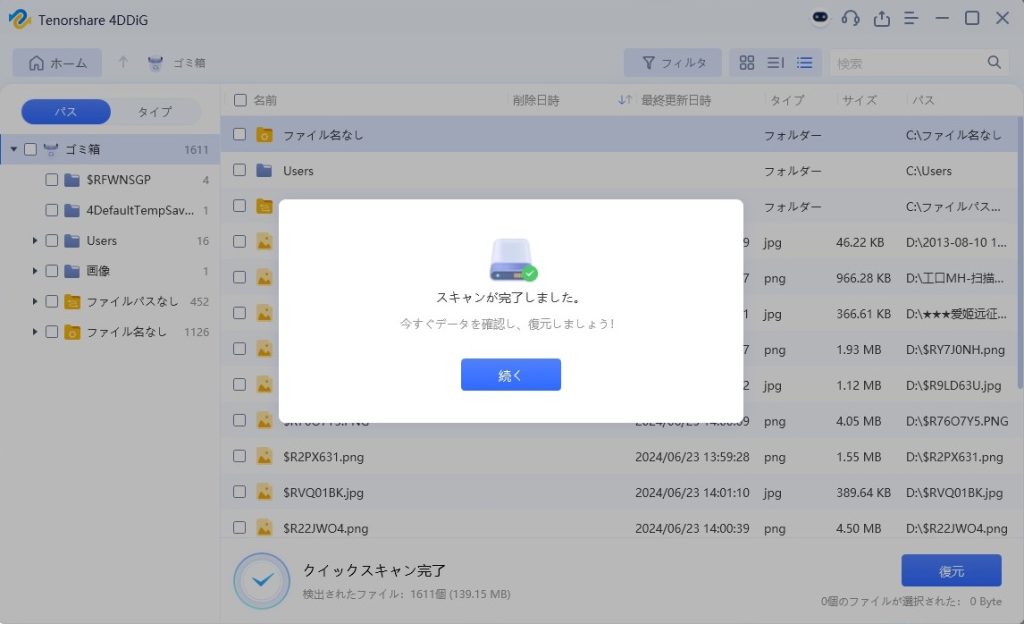 スキャンが完了しました。検出されたファイルは「1611個」「139.15MB」と出ていますね。結構な量がサルベージされたようです。