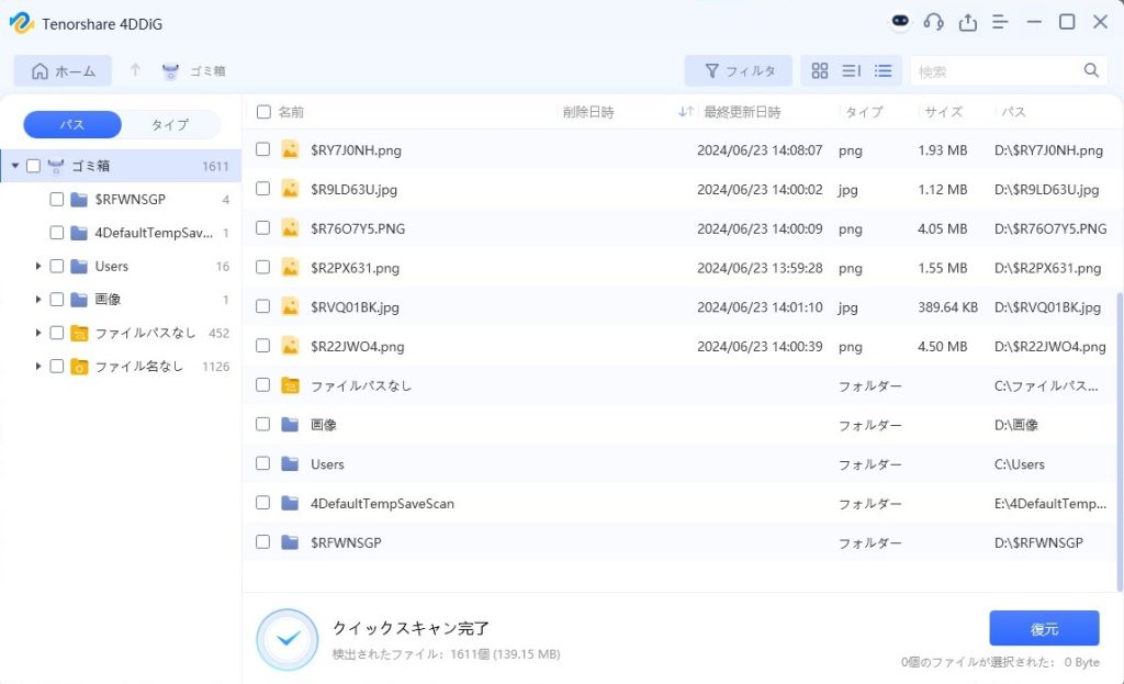 Tenorshare 4DDiGで「ゴミ箱」をスキャンしてみます。