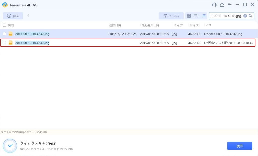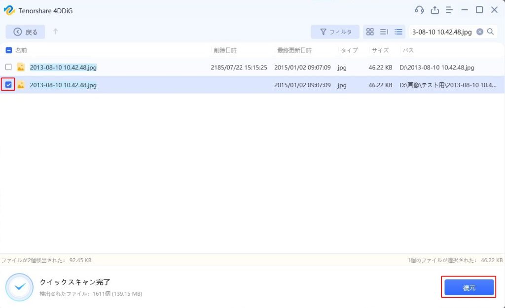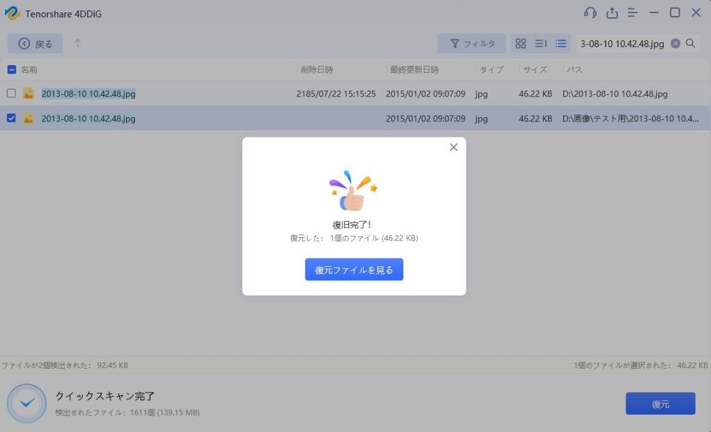 それでは期待を込めて、ファイルのチェックを入れて「復元」をクリックします。