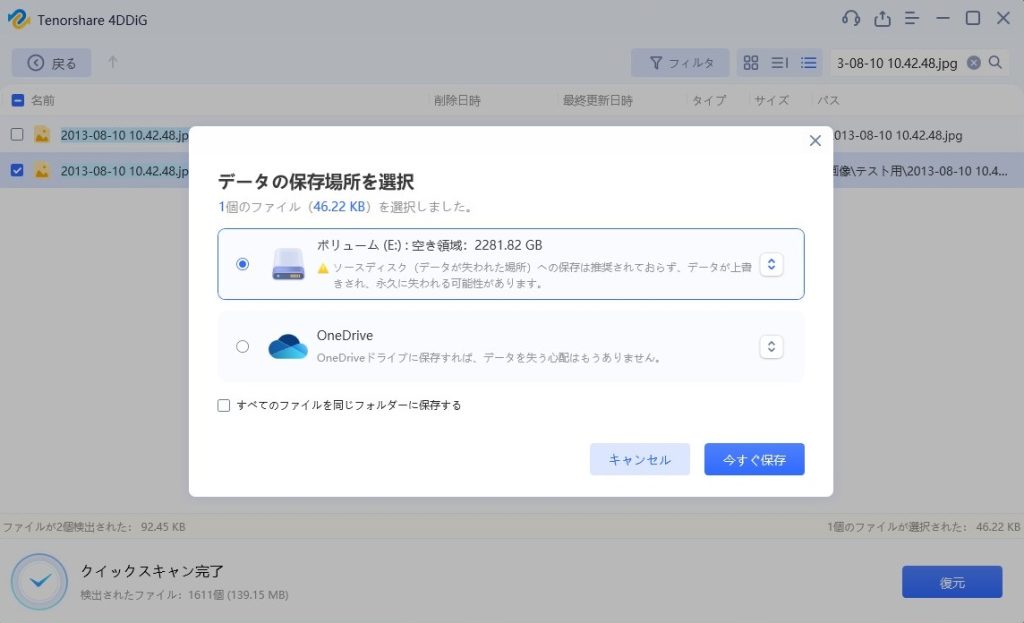 「ボリューム(E:)」を選択して、「今すぐ保存」をクリックします。