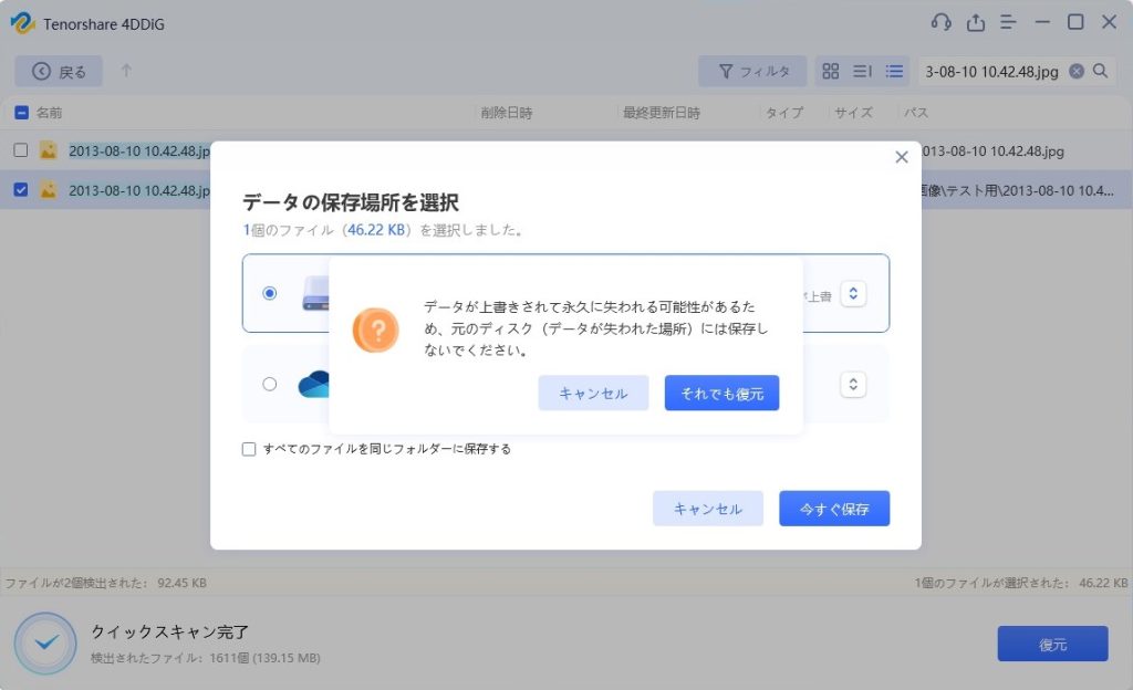 だいたいデータ復元を行うような時って、ドライブが壊れたとかそういう時ですよね。なので、同じ場所にファイルを復元してしまうと、データが再度壊れる可能性があるので、別の場所に保存してねと言っているのです。