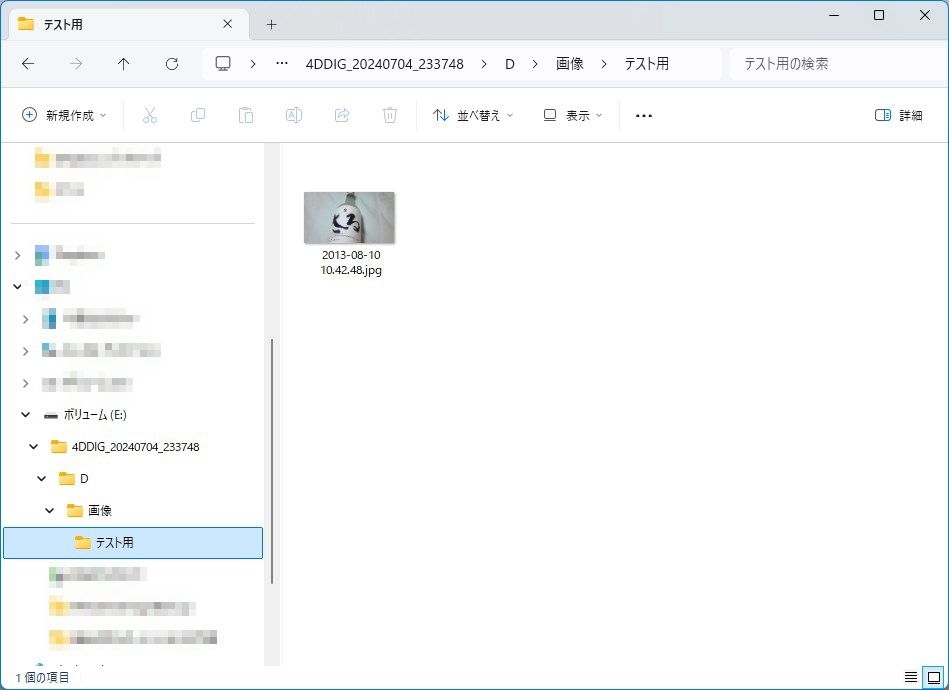 「復元ファイルを見る」をクリックして、きちんとファイルが復元されたかを確認してみましょう。「4DDiG_西暦月日_時刻分秒」というフォーマットのフォルダが作成され、それ以下にフォルダとともに画像が復元されていることが確認できました。