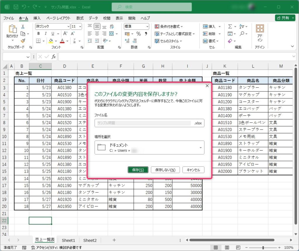 作業中のブックのウィンドウを閉じるには、「CTRL+W」キーを押します。編集中の場合、次のように変更内容を保存するかどうかのウィンドウが出ます。