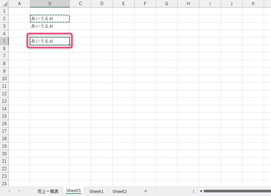直前で例えば、「あいうえお」入力されたセルをコピーし適当なところに貼り付けたとします。