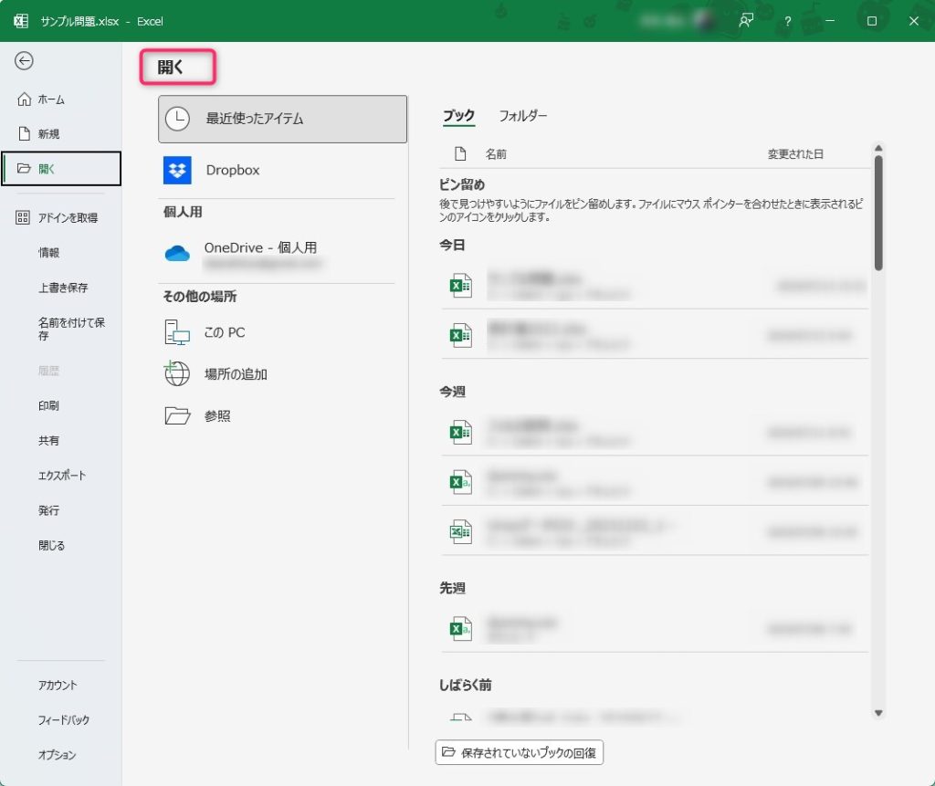 「開く」Backstageビューを表示する