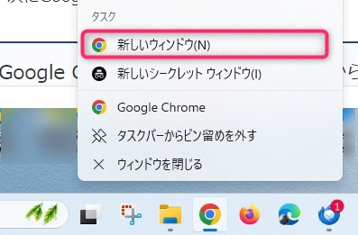 新しくGoogle Chromeを立ち上げます。新しく立ち上げるには、タスクバーのGoogle Chromeのアイコンを右クリックし、「新しいウィンドウ」をクリックします。