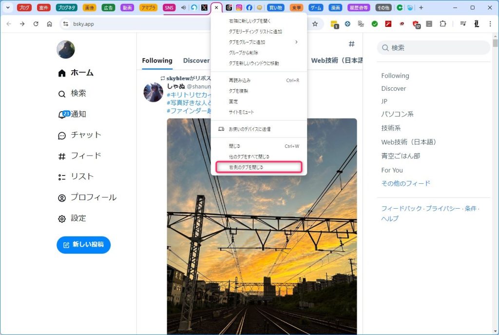 Google Chromeで、現在選択しているタブから右側のタブをすべて閉じたいというときには、次の方法で閉じます。
